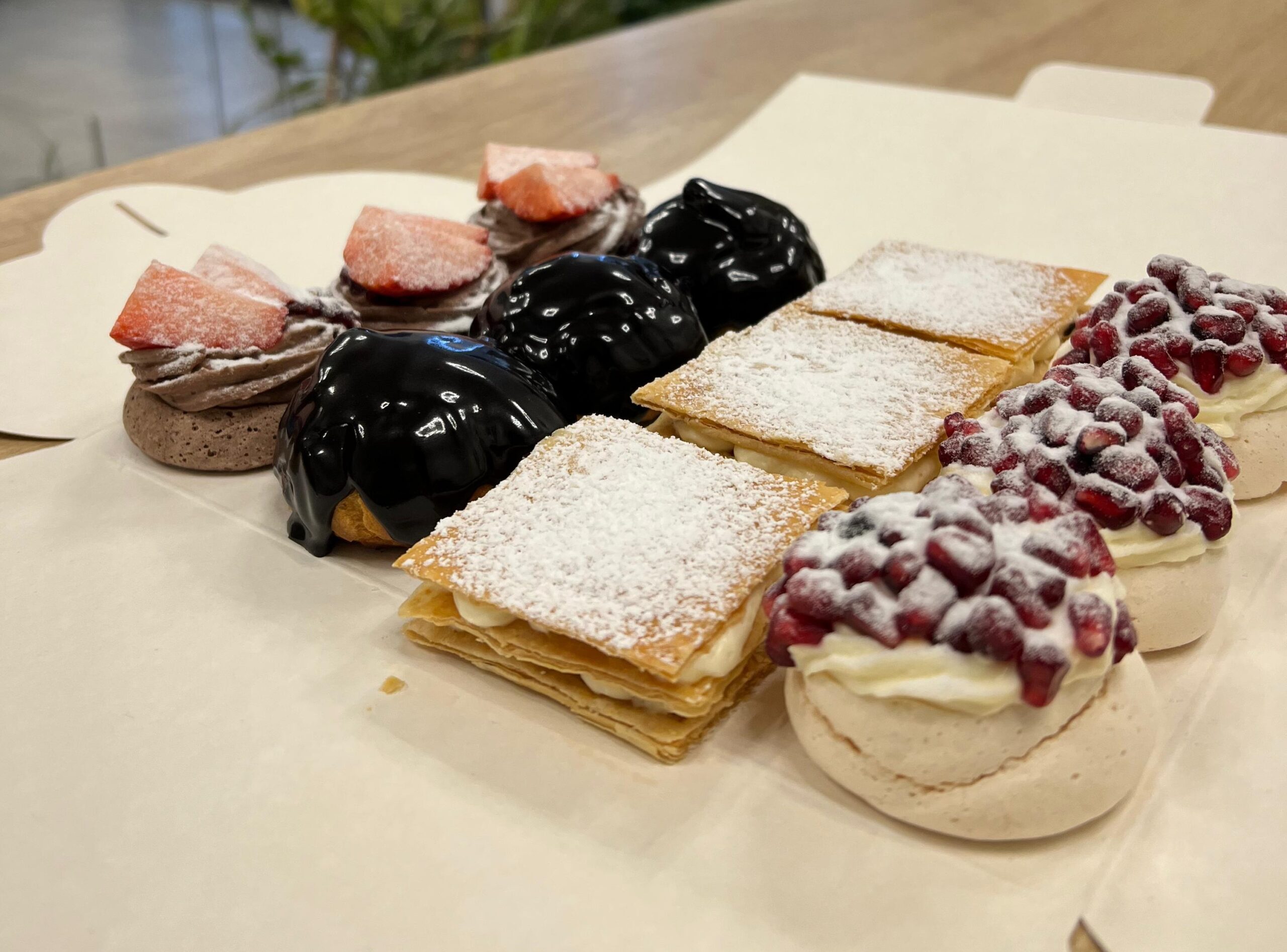 3 mini bezele mering, 3 mini bezele cioco, 3 choux, 3 mini millefeuille